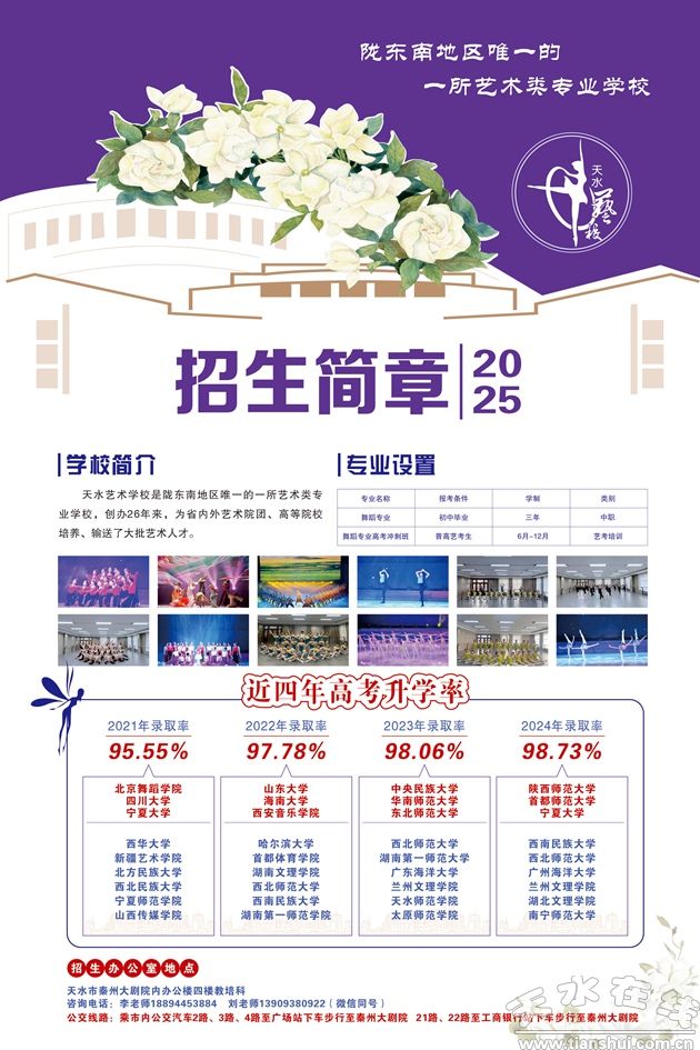 天水藝術(shù)學(xué)校師資力量雄厚,實(shí)踐平臺優(yōu)越,創(chuàng)辦26年來,為省內(nèi)外藝術(shù)院團(tuán)、高等院校培養(yǎng)、輸送了大批人才。