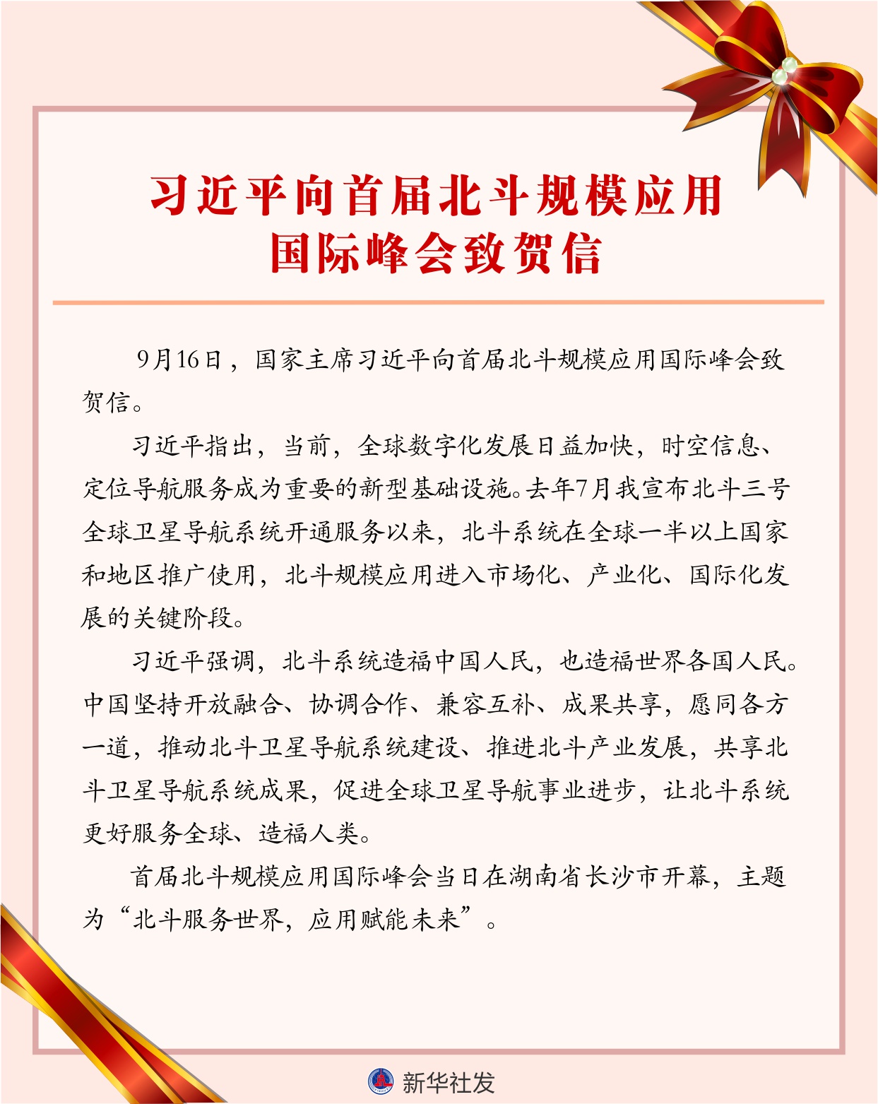 新華社北京9月16日電 9月16日,國家主席習近平向首屆北斗規(guī)模應用國際峰會致賀信。