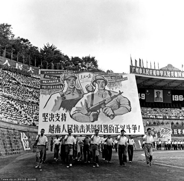 1964年10月1日,廣州市人民慶祝中華人民共和國(guó)成立15周年大會(huì)在越秀山體育場(chǎng)舉行。市民抬著聲援越南反美巨幅宣傳畫游行黎楓FOTOE