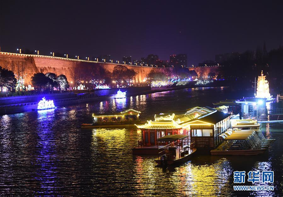 這是2月11日在南京大報(bào)恩寺遺址公園附近拍攝的燈景。 2月11日,第32屆秦淮燈會(huì)在南京大報(bào)恩寺遺址公園亮燈。本屆秦淮燈會(huì)以“燈耀古金陵奮進(jìn)新時(shí)代”為主題,共展出200多個(gè)燈組,將持續(xù)至3月底。 新華社記者孫參攝