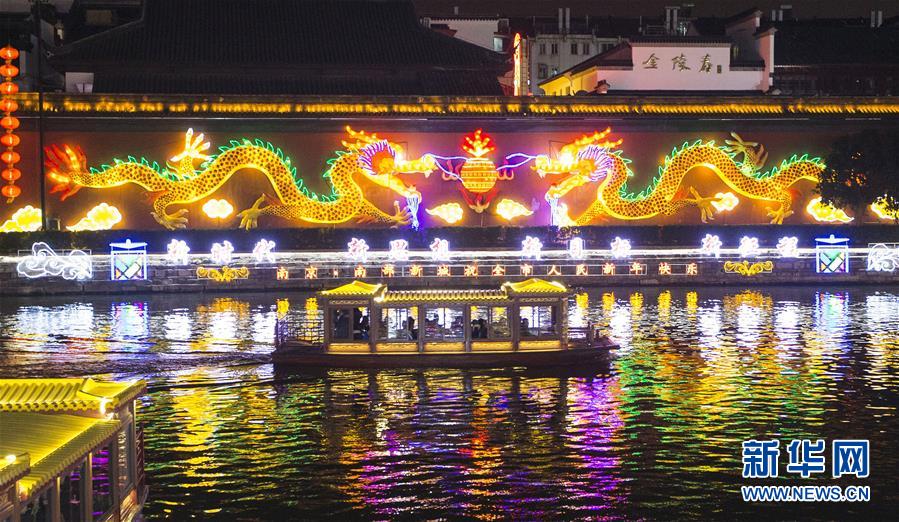 2月11日,游人在南京夫子廟景區(qū)乘船觀燈游覽。