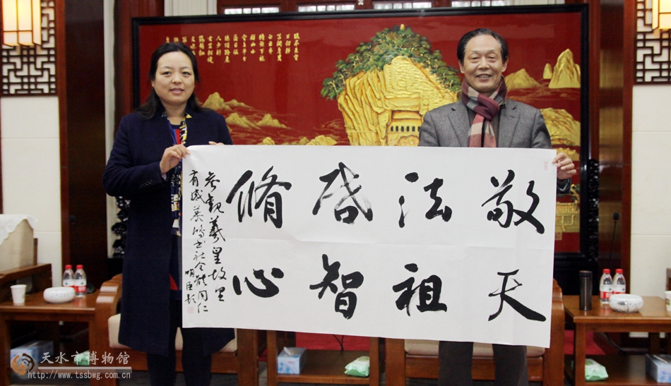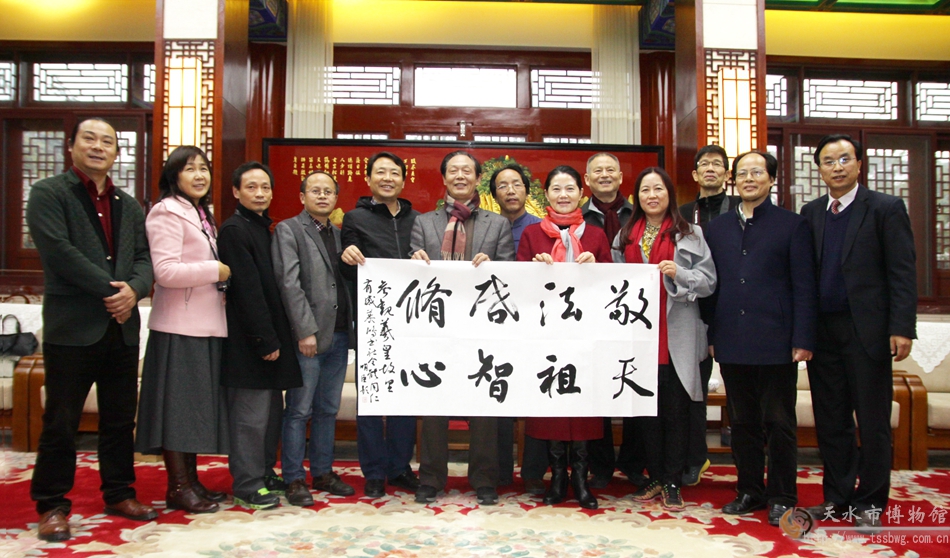 當日下午,慕鴻書社一行二十余人來到天水博物館、伏羲廟進行參觀。通過博物館講解員熱情周到的服務、生動幽默的講解,激發(fā)了大家對伏羲文化的熱情。參觀結束后,慕鴻書社社長、中國書法家協(xié)會理事、楷書專業(yè)委員會副主任、解放軍美術書法研究院藝委會委員、空軍美術書法研究院院長、清華大學美術學院特聘教授楊明臣興筆揮毫,題寫了“敬天法祖,啟智修心”八個大字,表達藝術家對人文始祖伏羲的敬仰之情。