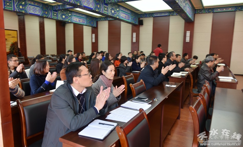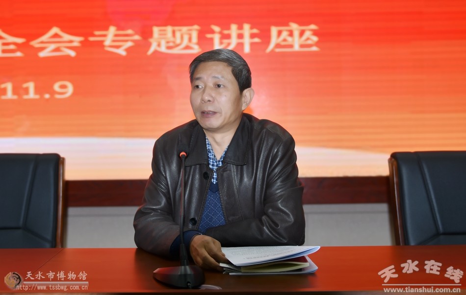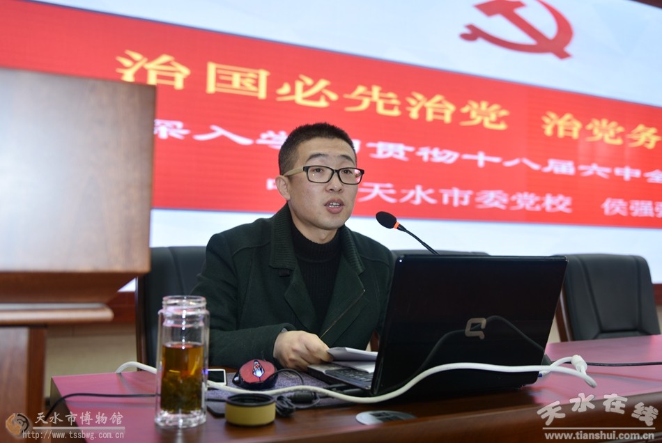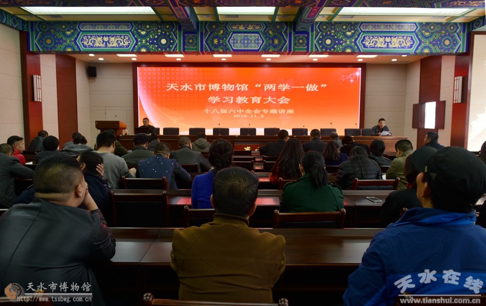 11月9日下午,天水市博物館在明道堂召開(kāi)“兩學(xué)一做”學(xué)習(xí)教育大會(huì),邀請(qǐng)?zhí)焖形h校黨史與黨建研究室講師候強(qiáng)強(qiáng)作《治國(guó)必先治黨,治黨務(wù)必從嚴(yán)》深入學(xué)習(xí)貫徹十八屆六中全會(huì)精神專(zhuān)題報(bào)告。天水市文化和旅游局副局長(zhǎng)、市博物館館長(zhǎng)、黨支部書(shū)記李寧民出席會(huì)議,并暢談了學(xué)習(xí)教育心得,傳達(dá)了中共天水市第七次黨代會(huì)會(huì)議精神和剛剛召開(kāi)的市人大、市政協(xié)會(huì)議精神。
