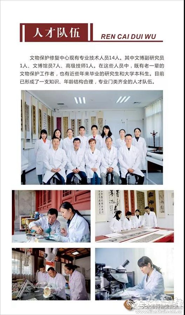千里之行,始于足下。天水市博物館自1979年11月建館之初,就把文物保護工作作為博物館的一項重要工作,積極開展了文物的日常養(yǎng)護工作。1986年博物館遷入伏羲廟后,對伏羲廟古建筑進行了勘測和修繕。進入21世紀,隨著人員的增加,單位高度重視文物保護工作,有計劃的開展館藏文物保護修復技術(shù)人員的培訓、設(shè)備的購置,同時開展館藏文物修復工作。2008年,取得了可移動文物修復資質(zhì),2011年可移動文物技術(shù)保護設(shè)計資質(zhì)。2012年2月,天水市博物館決定正式成立文物保護修復中心。2014年,根據(jù)國家文物局頒布的《可移動文物保護修復實驗室規(guī)范化建設(shè)與儀器裝備基本要求》,天水市博物館決定對修復中心實驗室、修復室進行了提升改造,并采購了一批先進的設(shè)備儀器,同時獲得國家文物局頒發(fā)的“可移動文物修復資質(zhì)證書”。天水市博物館文物保護修復中心現(xiàn)有專業(yè)技術(shù)人員14人。其中文博副研究員1人、文博館員7人、高級技師1人。在這些人員中,既有老一輩的文物保護工作者,也有近些年來新畢業(yè)的研究生和大學本科生。為了適應(yīng)新形勢下國家對文物保護修復工作提出的新要求,及時了解和掌握先進的文物保護修復理念和技術(shù),天水市博物館通過“請進來,走出去”的雙向交流機制培養(yǎng)保護修復人才百余名。目前已形成了一支知識、年齡結(jié)構(gòu)合理,專業(yè)門類齊全的人才隊伍。