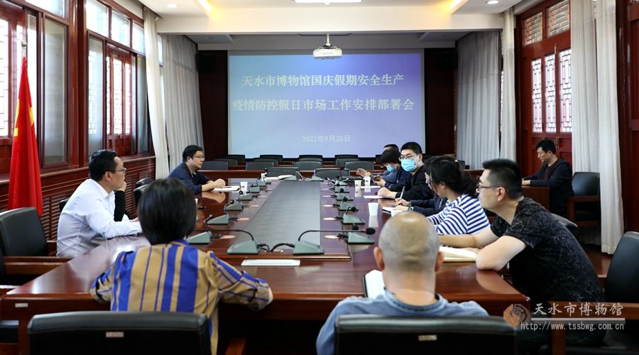 9月28日下午,天水市博物館召開了國慶節(jié)前安全生產(chǎn)及疫情防控工作會(huì)議,認(rèn)真學(xué)習(xí)習(xí)近平總書記關(guān)于安全生產(chǎn)工作重要批示精神,傳達(dá)學(xué)習(xí)全國國慶假期文化和旅游行業(yè)安全生產(chǎn)疫情防控假日市場工作電視電話會(huì)議精神,并根據(jù)上級(jí)部門相關(guān)要求,部署國慶假期期間市博物館有關(guān)工作。市博物館在家領(lǐng)導(dǎo)班子成員及各部室主任參加會(huì)議。