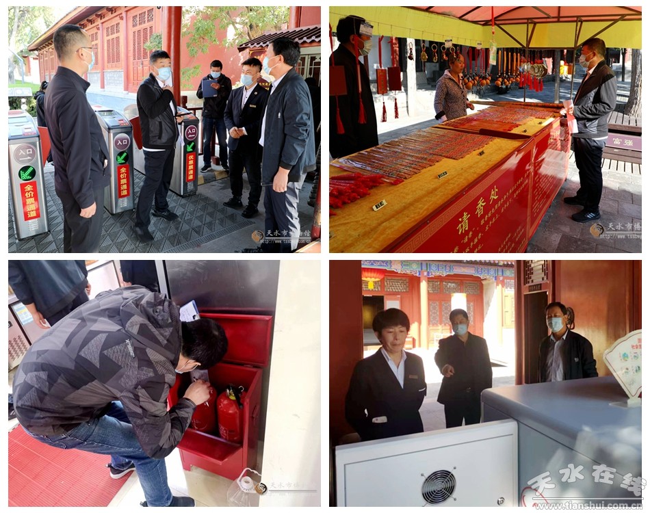 會(huì)后,由副館長高世華帶隊(duì)的檢查組深入景區(qū),重點(diǎn)對(duì)伏羲廟、胡氏古民居建筑(天水民俗博物館),博物館文物展廳、配電室、職工食堂等重點(diǎn)要害部位及辦公區(qū)域的用火用電情況、安全管理制度落實(shí)情況、節(jié)日安全措施及預(yù)案制定情況、疫情防控工作人員安排和制度落實(shí)情況、各部室職工安全防范意識(shí)和安全知識(shí)和技能掌握情況、隱患排查治理情況等進(jìn)行了檢查,同時(shí)對(duì)單位的道路水源、疏散通道、電氣線路、安、消防設(shè)施、設(shè)備及器材進(jìn)行了全面檢查。
