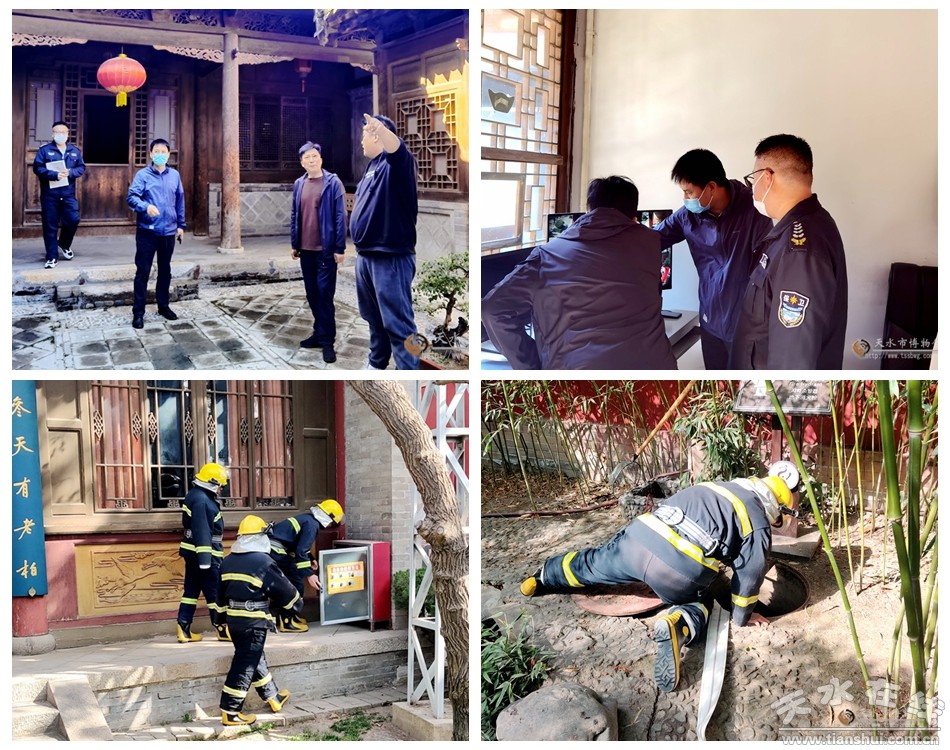 同時(shí),天水市博物館聯(lián)合天水市消防救援支隊(duì)新華路特勤救援站開展了國慶節(jié)前的消防演練活動(dòng)。結(jié)合我館實(shí)際情況,針對(duì)伏羲廟先天殿、太極殿等文物古建筑模擬火災(zāi)進(jìn)行滅火處置程序。消防報(bào)警后,保衛(wèi)人員立即前往微型消防站著裝,并啟動(dòng)來鶴軒門口地下消火栓,對(duì)先天殿古建筑進(jìn)行補(bǔ)救初期火災(zāi)。新華路特勤救援站在中院出三把水槍,在后院出一路消防炮對(duì)先天殿進(jìn)行前后夾擊,并測量水壓和對(duì)整個(gè)古建筑水流覆蓋情況。