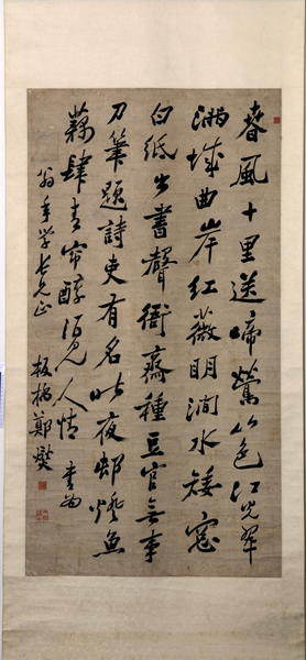 題詩:“春風十里送啼鶯,山色江光翠滿城。曲岸紅薇明澗水,矮窗白紙出書聲。衙齋種豆官無事,刀筆題詩吏有名。昨夜村燈魚藕肆,青簾醇酒見人情。書為翁年學長兄正,板橋鄭燮!毕骡j“乾隆東封書畫史”白文印、“丙辰進士”朱文印。