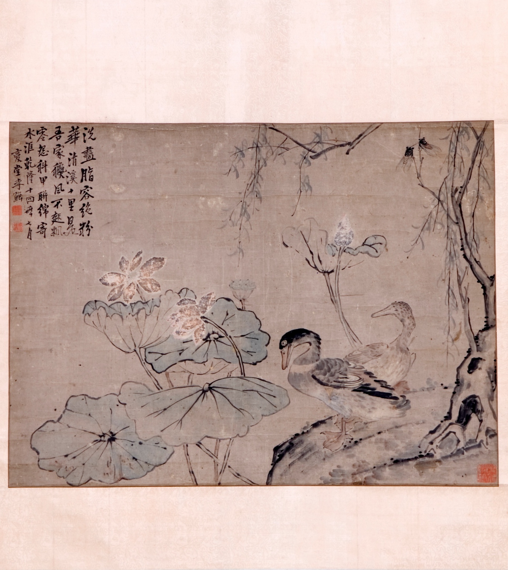 紙本設色。此畫描繪了江蘇興化郊外十里清溪荷塘之景。左上方自題詩:“洗盡脂容絕粉華,清溪十里是吾家。秋風不起飄零怨,科甲連綿寄水涯!甭淇睿呵∈哪昶咴拢瑥吞美铟W。下鈐 “鱓印”白文印、“宗楊”朱文印,右下角鈐“李忠定文定子孫”白文印。