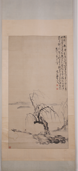 紙本設色。右上方草書題跋:“楊柳毿毿曲曲村,滄浪唱罷又黃昏。忘言自是蘆中叟,買酒還招楚客魂。蕩破水云歸釣艇,飛空蘿月掛江門。不知何處有耕鑿,天漢為家認故園。”落款:“乾隆□年春三寫,寧化癭瓢子寫”,下鈐“黃慎”、“癭瓢”白文印。左下角一方壓角印“東海布衣”。