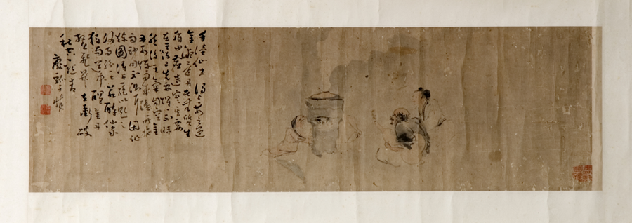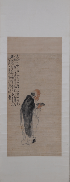 紙本設色。左側(cè)草書題跋:“手讀仙書,得上乘之道。金液還丹者,無質(zhì)生質(zhì),由虛造實,其要在于煉己。先要惺惺不昧,然后其氣自空,金丹可煉而成。隨所施,而妙用不測耳!因作煉圖,漫占一絕以題之:‘何事紛紛皆若醉,仙家獨自道中醒。金丹教其飛升去,沖破秋空一點青。’”落款:“癭瓢子慎!毕骡j“黃慎”朱文印、“恭壽”白文印。
