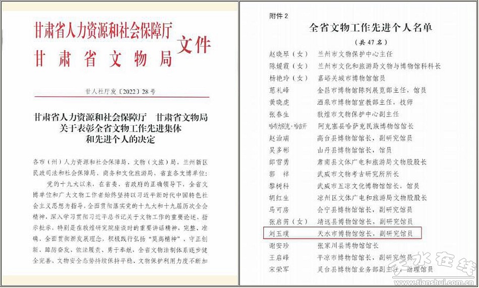 2022年11月7日,甘肅省人力資源和社會(huì)保障廳、甘肅省文物局決定,對全省文物工作先進(jìn)集體和先進(jìn)個(gè)人進(jìn)行表彰,天水市博物館劉玉璞同志被授予“全省文物工作先進(jìn)個(gè)人”稱號(hào)。