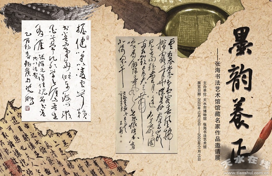 翰墨飄香歌盛世,丹青亮彩寫華章。為全面落實(shí)黨的二十大精神,弘揚(yáng)中華優(yōu)秀傳統(tǒng)文化,踐行社會(huì)主義核心價(jià)值觀,加強(qiáng)天水與洛陽兩地的文化藝術(shù)交流,促進(jìn)文旅深度融合發(fā)展,天水市博物館特邀張海書法藝術(shù)館共同舉辦“墨韻養(yǎng)正——張海書法藝術(shù)館館藏名家作品邀請(qǐng)展”。該展覽地點(diǎn)位于天水市博物館第一臨展廳,展覽時(shí)間是2022年12月15日至2023年1月15日。歡迎廣大市民、游客前來參觀!