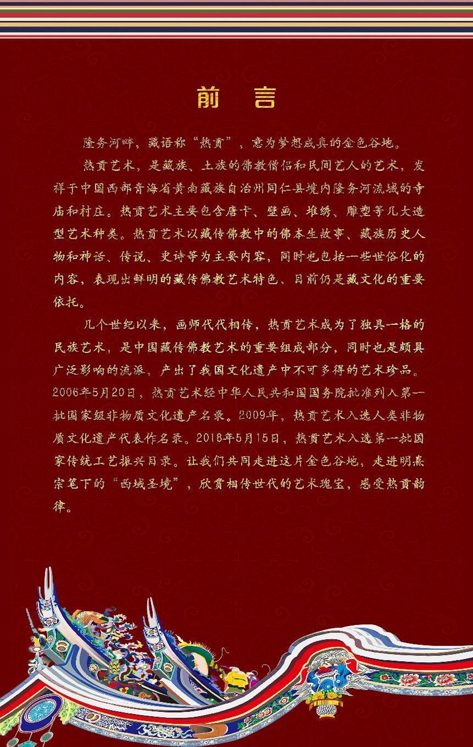 熱貢藝術(shù)發(fā)源于中國(guó)西部青海省黃南藏族自治州同仁縣境內(nèi)隆務(wù)河流域的寺廟和村莊,是藏族、土族的佛教僧侶和民間藝人共同創(chuàng)立的一門藝術(shù),主要包含唐卡、壁畫(huà)、堆繡、雕塑等幾大造型藝術(shù)種類。以藏傳佛教中的佛本生故事、藏族歷史人物和神話、傳說(shuō)、史詩(shī)等為主要內(nèi)容,同時(shí)也包括一些世俗化的內(nèi)容,表現(xiàn)出鮮明的藏傳佛教藝術(shù)特色,是我國(guó)藏傳佛教藝術(shù)的重要組成部分。