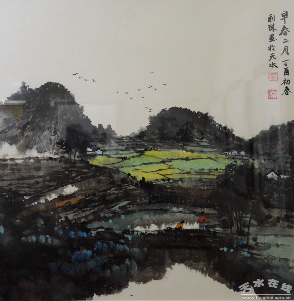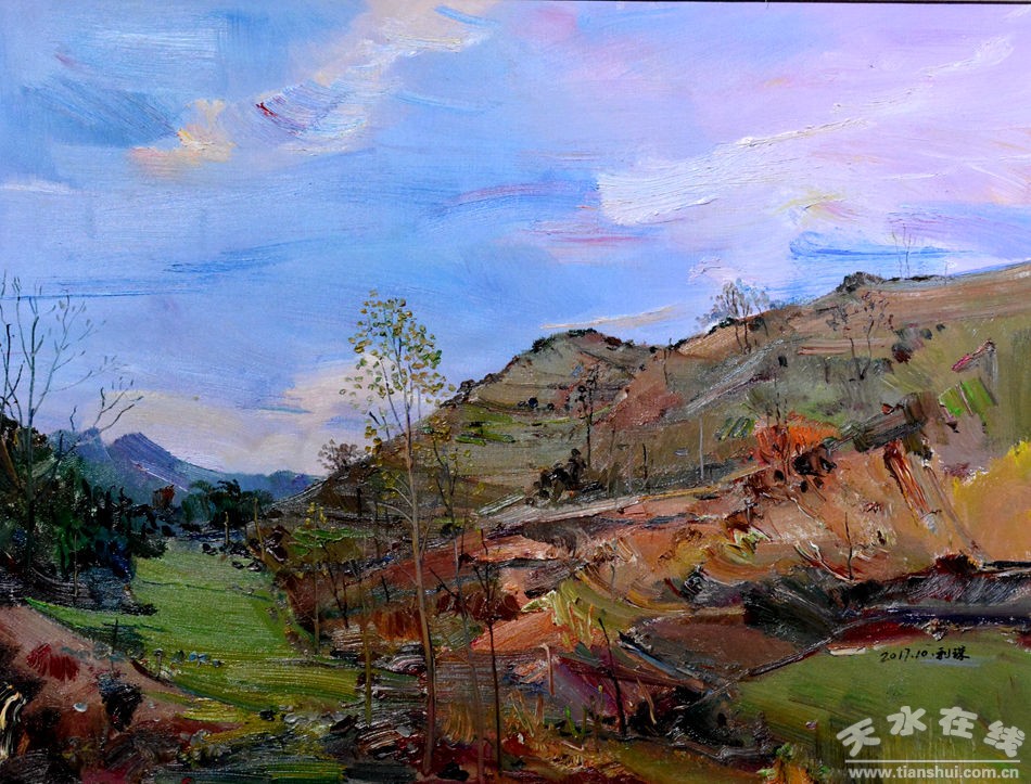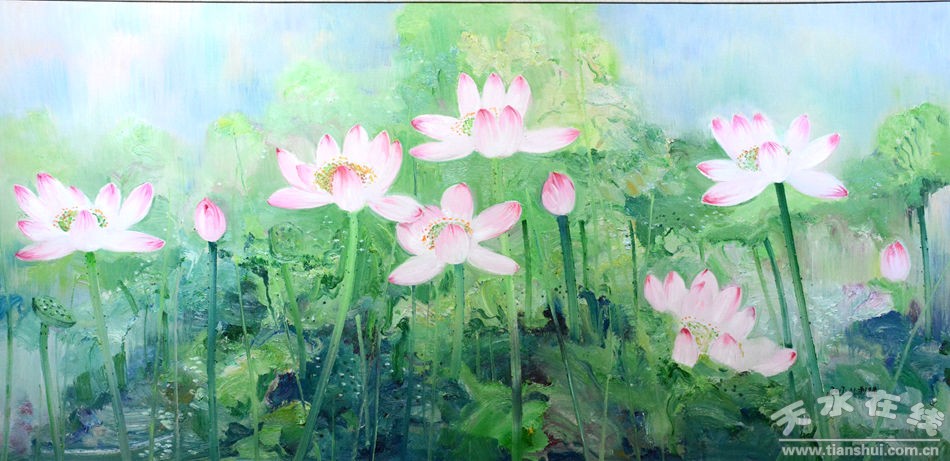 觀看賈利珠先生的中國畫,頓有田野風(fēng)來自帶香之感。無論他的油畫還是中國畫,他都是從實(shí)踐中脫穎出手。他是科班出身,重視寫生與觀察,他常年奔走于隴山隴水的每處地方,用自己的眼睛、心靈、感覺和對這片土地的摯愛去觀察、捕捉、描繪大美的物象,通過自己的特殊審美,傳遞出隴原厚重的歷史人文與自然風(fēng)光的精華所在。他的許多畫作,用藝術(shù)的形式,再造了隴原的神韻,使觀者得到了美的享受。他的繪畫語言明朗、光華、向上、溫婉、恬靜、莊雅,展示了作者優(yōu)良的審美情趣。他是油畫本業(yè),從而在中國畫中不知不覺地體現(xiàn)出了油畫的精神與韻味。大部分中國畫,無論人物與山水,除展示出扎實(shí)的線描等技法外,把油畫中的暈染、光色等技巧融入其中,使畫面顯得更為飽滿、充實(shí)、雋永,對視覺形成沖擊力。賈利珠先生是有想法的畫家,他的荷花系列作品明顯帶有創(chuàng)新思維,力圖想把西畫的手法用中國的毛筆與顏料表現(xiàn)出來。他的山水小品相當(dāng)精致,尺幅之內(nèi)可以跑馬,中國傳統(tǒng)的文人畫的精神彰顯其中。