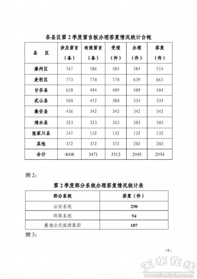 附:1、各縣區(qū)第2季度留言板辦理情況統(tǒng)計(jì)臺(tái)帳