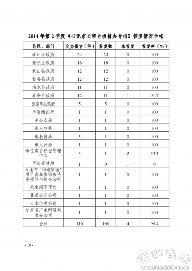 按照《天水市委書記市長(zhǎng)留言板辦理工作規(guī)定》的要求,市投訴中心每天有專人負(fù)責(zé)瀏覽、篩選、下載網(wǎng)民留言,及時(shí)對(duì)網(wǎng)民留言所涉及的部分熱點(diǎn)、難點(diǎn)問(wèn)題以及網(wǎng)民訴求情況進(jìn)行綜合分析,每周定期編發(fā)《市委書記市長(zhǎng)留言板督辦專報(bào)》,并以《督辦專報(bào)》的形式轉(zhuǎn)交各縣區(qū)、市直有關(guān)部門、有關(guān)責(zé)任單位負(fù)責(zé)辦理落實(shí)并要求按時(shí)限在留言板網(wǎng)上答復(fù)。書記、市長(zhǎng)高度關(guān)注每期《督辦專報(bào)》上網(wǎng)民反映問(wèn)題或建議的辦理落實(shí)情況,要求及時(shí)辦理落實(shí)并網(wǎng)上答復(fù)。據(jù)統(tǒng)計(jì),2014年第2季度共印發(fā)《督辦專報(bào)》39期,涉及督辦問(wèn)題110件,辦理答復(fù)106件,答復(fù)率為96.4%,未辦理答復(fù)4件,占3.6%。