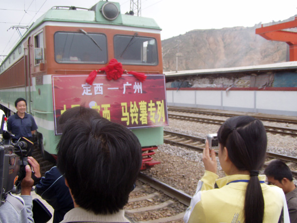 開幕式之后,全體與會者前往定西火車站參加了隆重的馬鈴薯專列發(fā)送儀式。上午11時48分,隨著蘭州鐵路局局長助理高金陽一聲令下,滿載定西“新大坪”優(yōu)良品種、載重2820噸的今年全市首列馬鈴薯專列從定西發(fā)往廣州大朗市場。