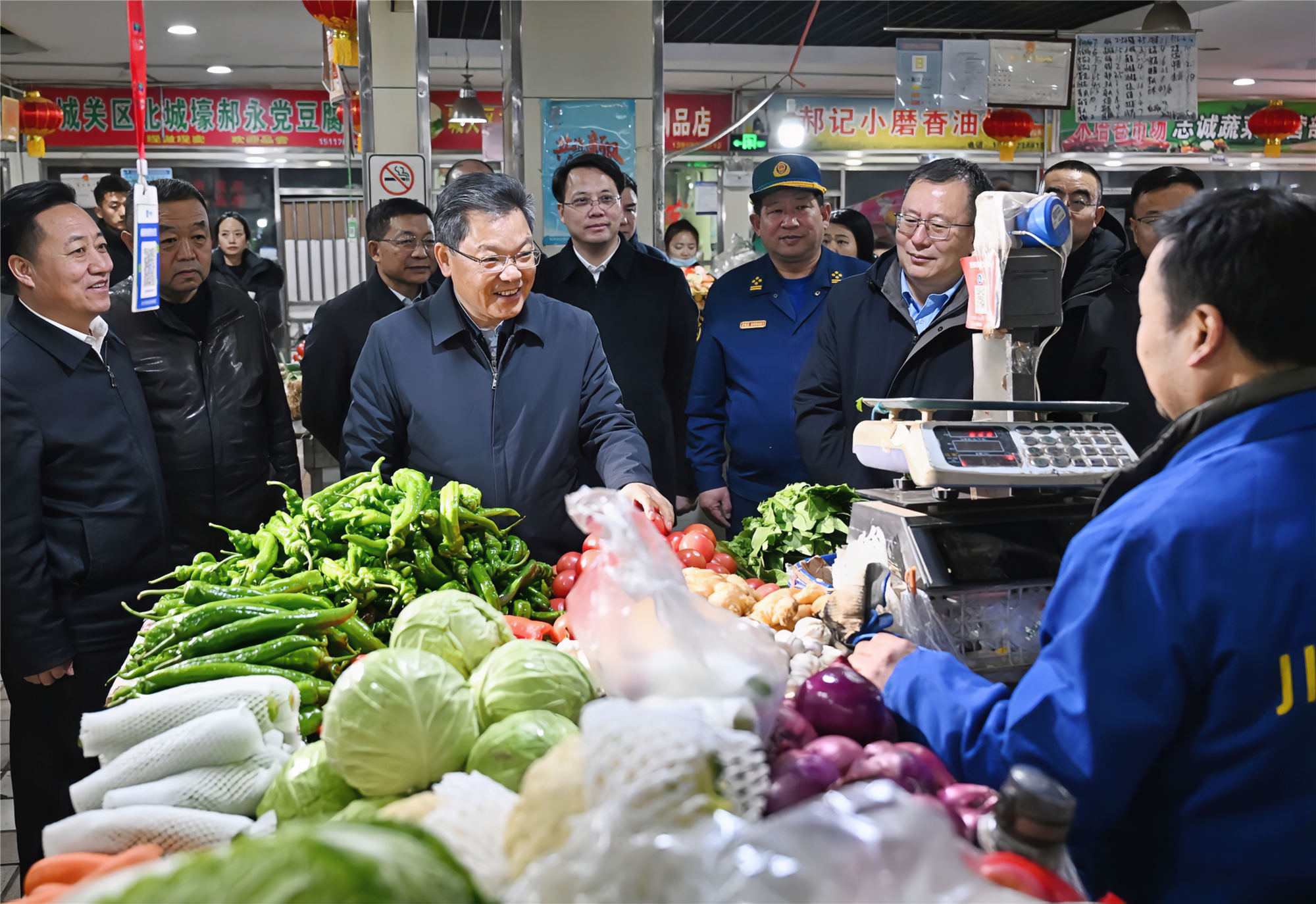 蘭州市城關(guān)區(qū)木塔巷菜市場,農(nóng)副產(chǎn)品一應(yīng)俱全,置辦年貨的市民絡(luò)繹不絕。任振鶴與工作人員、市場商販親切交談,問貨源、問儲備、問價格、問供應(yīng)。他強調(diào),春節(jié)是傳統(tǒng)的消費旺季,要不斷健全“監(jiān)測、調(diào)度、儲備”三張網(wǎng),及時掌握生活必需品重點品種生產(chǎn)、流通、消費的基本情況,切實加強節(jié)日期間民生商品的產(chǎn)銷保供,確保數(shù)量充足、品種豐富、質(zhì)量放心、價格穩(wěn)定,讓廣大群眾放心消費、快樂過年。