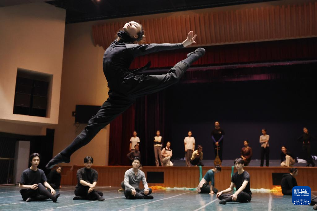 新版《絲路花雨》神筆張的扮演者羅志煒(前)在甘肅省歌舞劇院排練廳排練(11月3日攝)。