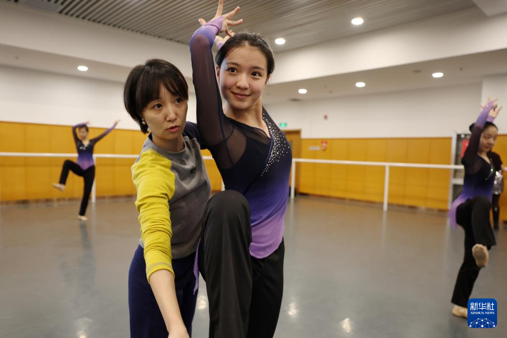 新版《絲路花雨》英娘扮演者康琦(右一)在甘肅省歌舞劇院排練廳排練(11月3日攝)。