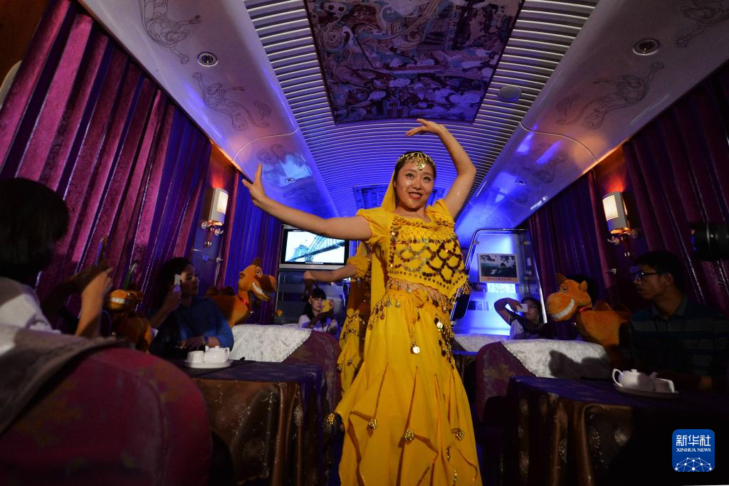 在蘭州鐵路局首發(fā)的“敦煌號”列車上,列車員身穿敦煌元素的服飾為旅客表演敦煌舞(2014年7月10日攝)。
