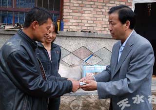 (柴金祥給村民武水生家屬送上慰問金及慰問品)