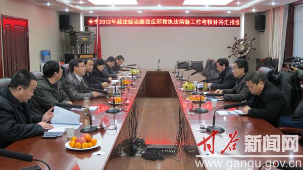 12月18日,市委政法委常務副書記陳明達帶領(lǐng)市政法綜治維穩(wěn)考核組,就甘谷縣2012年度政法綜治維穩(wěn)工作完成情況進行了全面考核?h委常委、常務副縣長李尚平,縣委常委、政法委書記邵宏偉,縣人大副主任魏慶英,縣政協(xié)副主席陳旭及相關(guān)部門負責人陪同考核。