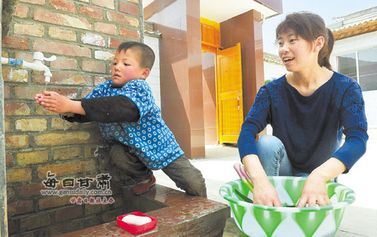 甘谷縣謝家灣鄉(xiāng)溝灘村,一名小朋友用家里的自來(lái)水洗手。為了徹底改變當(dāng)?shù)厝罕姵运y、吃水不安全的狀況,甘谷縣積極實(shí)施東北部農(nóng)村飲水安全工程,全面解決了新興鎮(zhèn)、金山鄉(xiāng)等東北部4個(gè)鄉(xiāng)鎮(zhèn)65個(gè)行政村10余萬(wàn)人的安全飲水問(wèn)題。本報(bào)記者李小龍