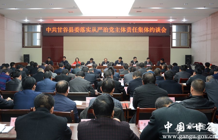 為進(jìn)一步落實(shí)全面從嚴(yán)治黨主體責(zé)任,11月19日,甘谷縣委召開落實(shí)從嚴(yán)治黨主體責(zé)任集體約談會(huì)?h委書記賈忠慧,縣人大常委會(huì)主任、縣人大黨組書記令建民,縣委副書記、縣政府黨組書記、縣長(zhǎng)申君明等縣四大組織領(lǐng)導(dǎo)出席會(huì)議。各鄉(xiāng)鎮(zhèn)黨委書記、鄉(xiāng)鎮(zhèn)長(zhǎng),縣直和駐縣有關(guān)部門單位主要負(fù)責(zé)人參加會(huì)議。
