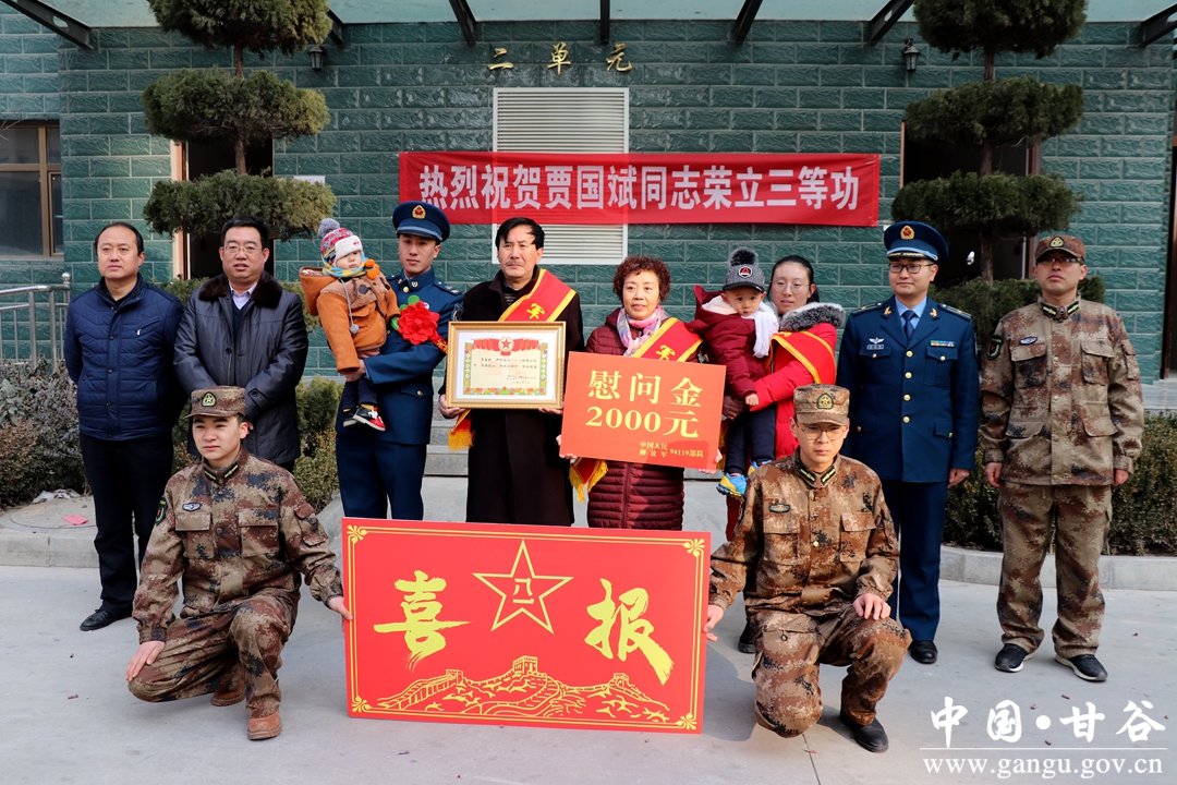 “您的孩子在部隊(duì)表現(xiàn)優(yōu)異,榮立三等功,我們給您送喜報(bào)來了!1月17 日,甘谷縣新興鎮(zhèn)政府收到了一份“喜報(bào)”,所轄濱河南路頤年新居居民賈國斌在空軍某部隊(duì)榮立“三等功”,部隊(duì)領(lǐng)導(dǎo)、縣人武部、新興鎮(zhèn)負(fù)責(zé)人一同來到賈國斌家中,將這份榮譽(yù)和慰問品及時送達(dá)家屬手中。