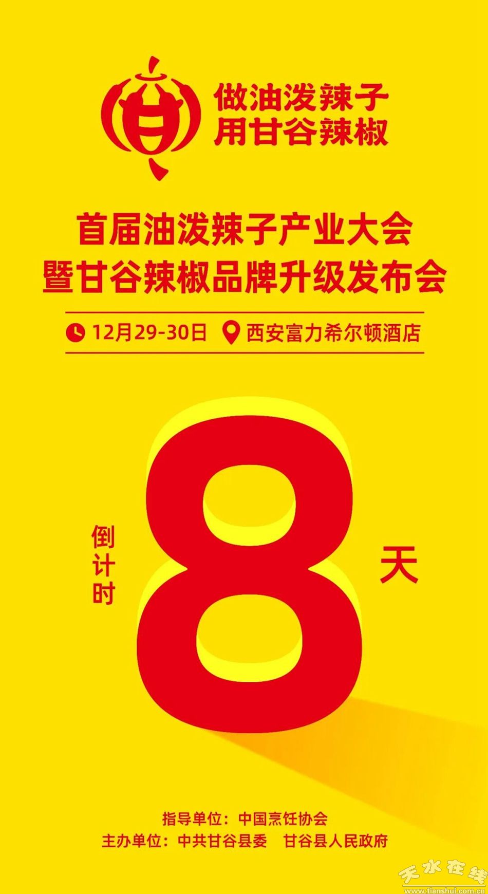 2025年12月29-30日,甘谷縣人民政府即將在西安富力希爾頓酒店,舉辦“首屆油潑辣子產(chǎn)業(yè)大會(huì)暨甘谷辣椒品牌升級(jí)發(fā)布會(huì)”。