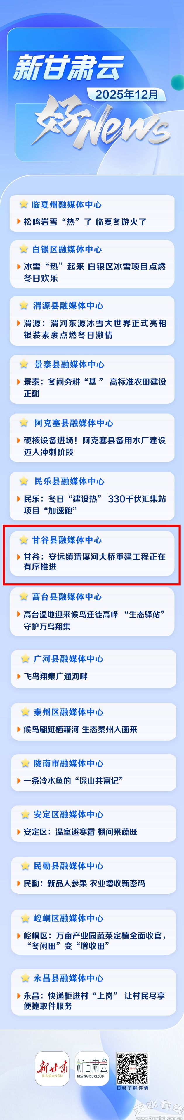 新甘谷訊【記者頡定武】又是一年收官季,熱火朝天正當(dāng)時(shí)。1月15日,2025年12月“新甘肅云好NEWS”發(fā)布,共有15篇稿件入選。其中,甘谷縣融媒體中心推送稿件《甘谷:安遠(yuǎn)鎮(zhèn)清溪河大橋重建工程正在有序推進(jìn)》成功入選。