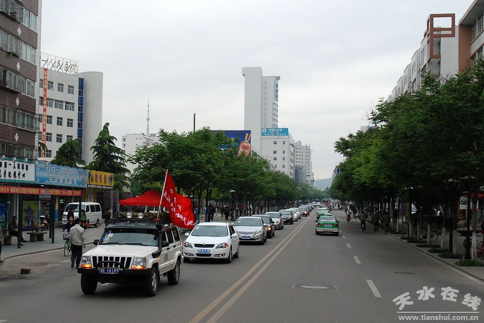 ▲2009年5月24日,天水在線舉行“周日自駕游 品嘗煙鋪大櫻桃”活動。當(dāng)日共有五十多輛車,二百多人參加了本次活動。圖為自駕車隊經(jīng)過百貨大樓)