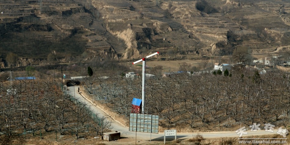 ▲2014年4月7日,秦州區(qū)玉泉鎮(zhèn)煙鋪村,春光明媚,大櫻桃園里果農(nóng)忙碌,櫻桃花含苞待放,滿山遍野蘊含著豐收的希望和喜悅。天水在線向村里捐贈的3臺防霜風(fēng)機已由天水鍛壓機床(集團)有限公司全部安裝到位,進入待工作狀態(tài),為大櫻桃撐起保護傘。
