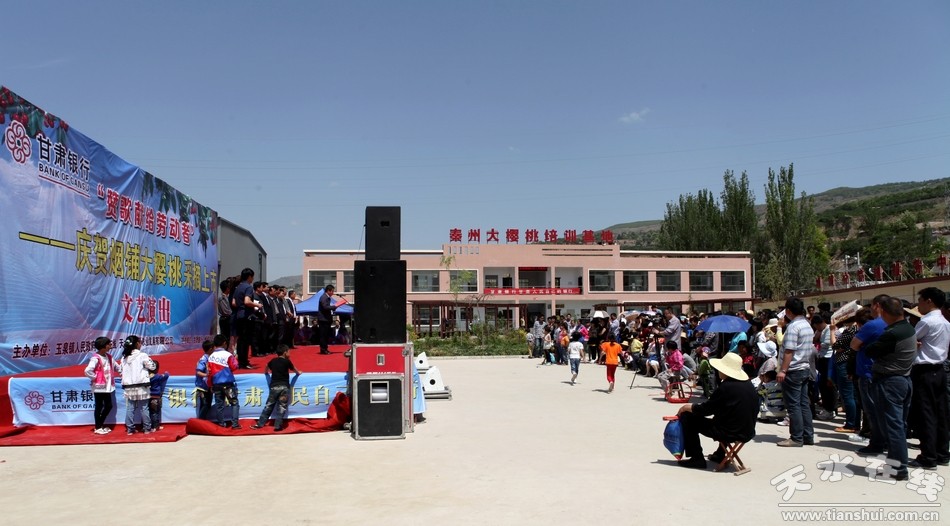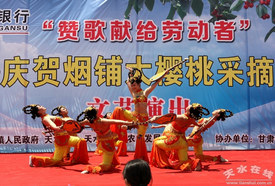 ▲2014年5月18日上午,由天水在線策劃、實施,甘肅銀行協(xié)辦的甘肅銀行“贊歌獻給勞動者”——慶賀煙鋪大櫻桃開摘上市文藝演出在秦州區(qū)煙鋪大櫻桃市場隆重舉行。