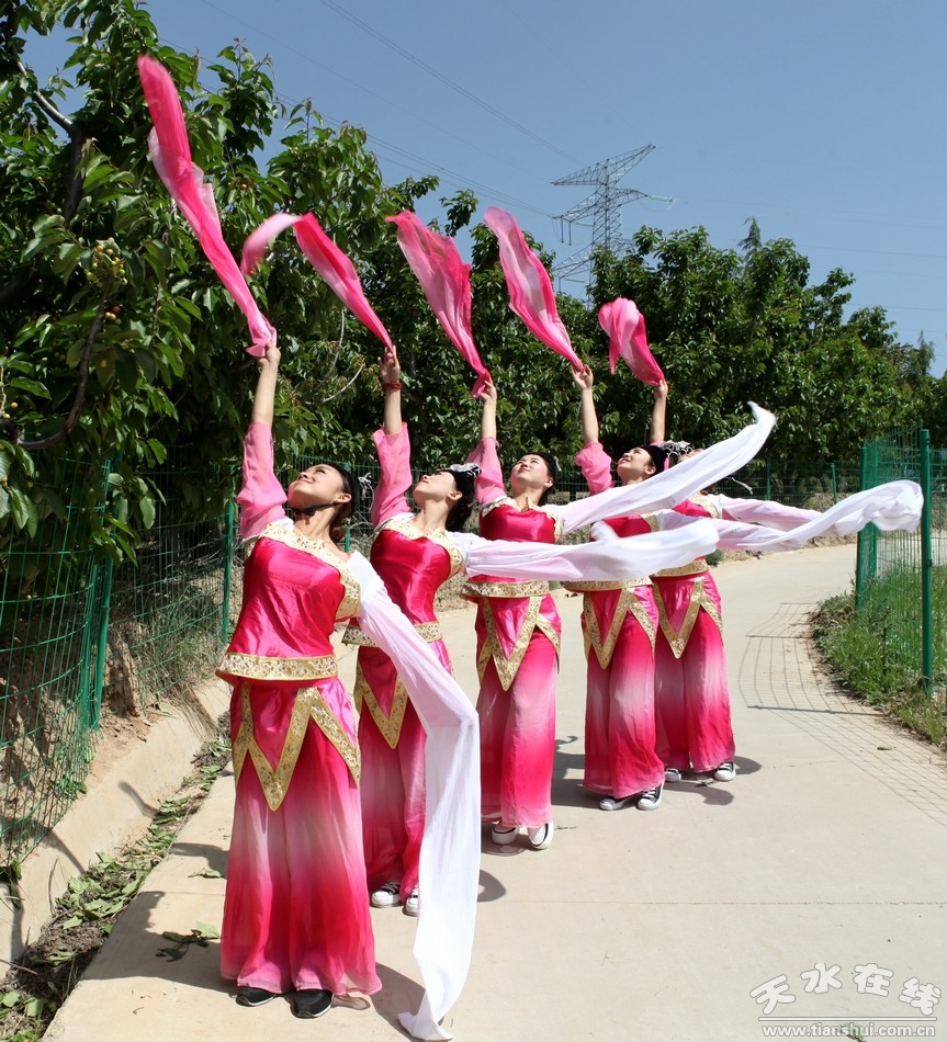 ▲2014年5月18日上午,天水市歌舞團的演員們在煙鋪櫻桃園翩翩起舞。