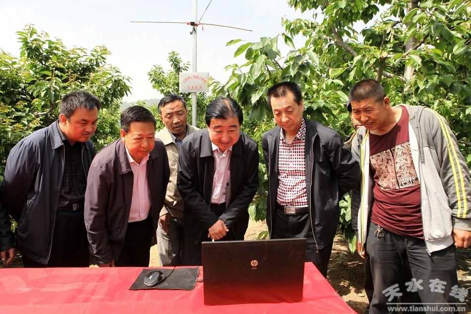 ▲2015年5月15日上午,天水在線“互聯(lián)網(wǎng)+煙鋪大櫻桃行動”啟動儀式在煙鋪櫻桃園舉行,標(biāo)志著由天水在線投資為煙鋪櫻桃園拉的光纖、網(wǎng)絡(luò)攝像頭、WIFI開始正式運行。天水市副市長霍衛(wèi)平,市政府副秘書長王小春,市林業(yè)局局長王學(xué)鋒,秦州區(qū)委常委、副區(qū)長李子園,秦州區(qū)林業(yè)局局長張雪亮,秦州區(qū)果業(yè)局局長王喜林等出席啟動儀式。