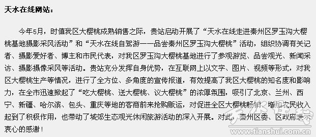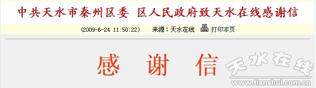 (圖為中共天水市秦州區(qū)委 區(qū)人民政府致天水在線感謝信)