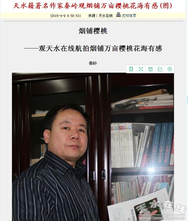▲2015年4月9日,天水在線發(fā)布天水籍著名作家秦嶺觀煙鋪萬畝櫻桃花海有感的文章。