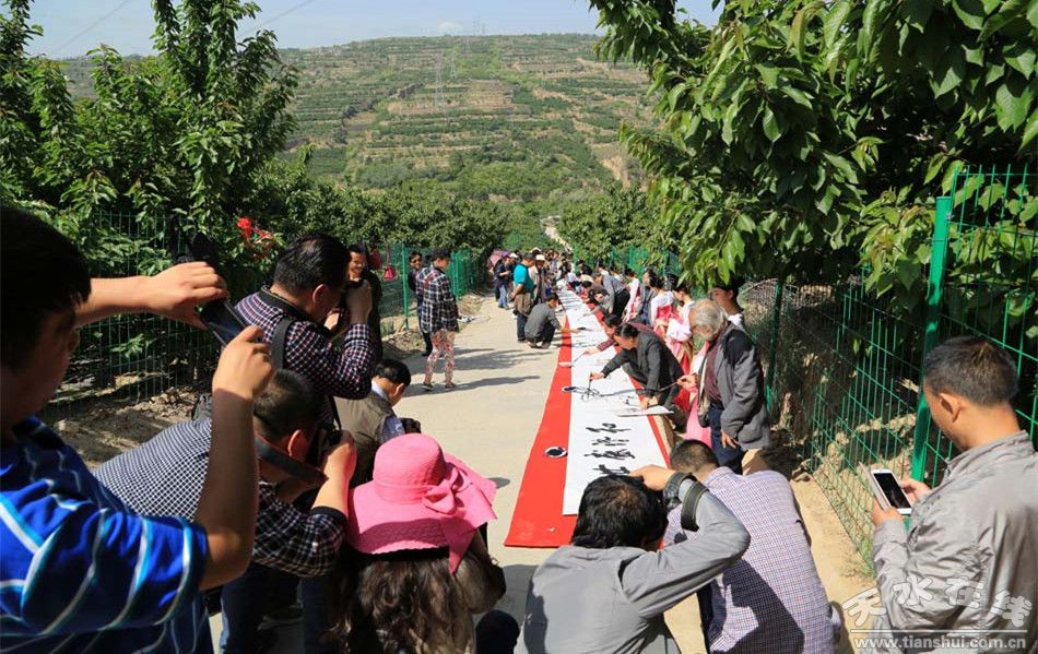 ▲2014年5月18日,是秦州區(qū)煙鋪大櫻桃基地今年第一批大櫻桃采摘上市的日子。在“贊歌獻給勞動者”——慶賀“煙鋪大櫻桃”開摘上市文藝演出在煙鋪大櫻桃市場隆重舉行的同時,應(yīng)天水在線邀請,天水書畫名家走進煙鋪大櫻桃基地采摘園創(chuàng)作“豐收圖”百米長卷,慶賀煙鋪大櫻桃在果農(nóng)們的“千般呵護、萬般寵愛”下迎來又一個豐收年。