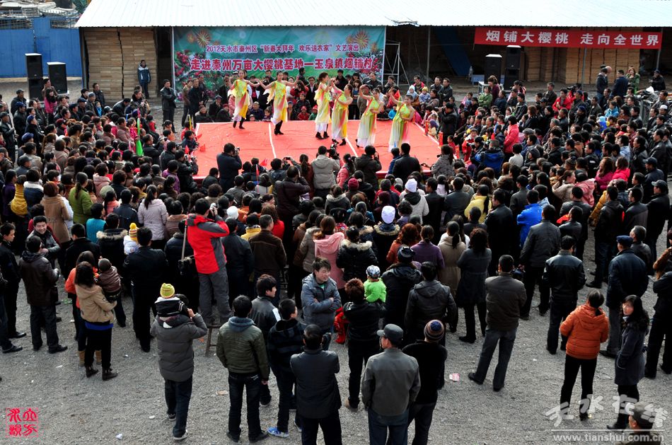 ▲2012年2月5日(正月十四),天水在線邀請秦州區(qū)文化館在秦州區(qū)萬畝大櫻桃基地——玉泉鎮(zhèn)煙鋪村舉行“新春大拜年 歡樂送農(nóng)家”文藝演出。