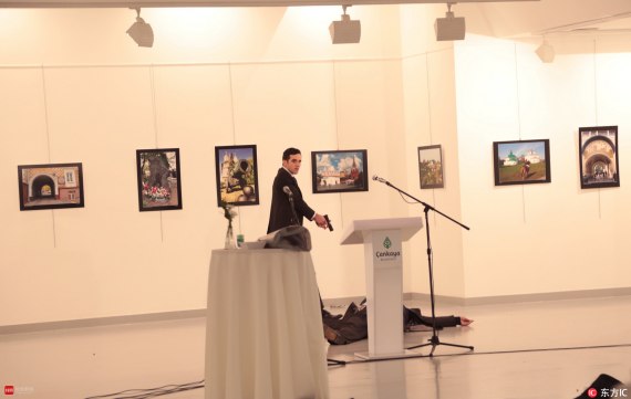 當(dāng)?shù)貢r(shí)間2016年12月19日,土耳其安卡拉,俄羅斯駐土耳其大使卡爾洛夫(karlov)在土耳其首都安卡拉遭槍擊。槍擊案發(fā)生時(shí),卡爾洛夫正在參加一個(gè)藝術(shù)展活動(dòng)。圖為持槍男子,躺在地上的為俄羅斯大使卡爾洛夫。東方ic供圖