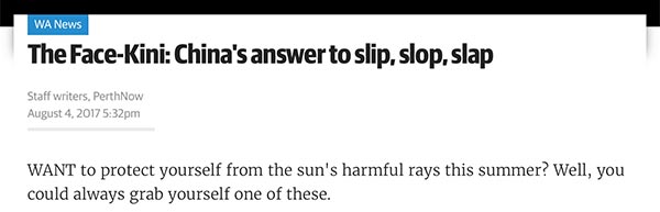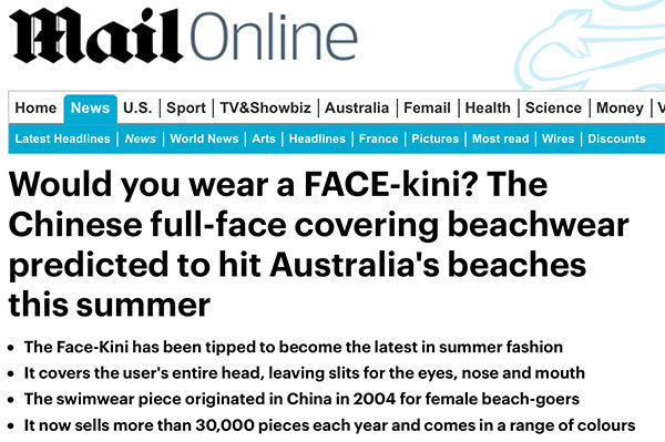 如果你想在夏天毒辣的陽(yáng)光下保護(hù)自己,那你就得隨身帶個(gè)‘臉基尼’了!卑拇罄麃啴(dāng)?shù)孛襟w《周日時(shí)報(bào)》網(wǎng)站也大力推薦“臉基尼”。