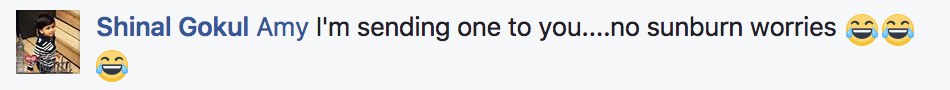 網(wǎng)友@Shinal Gokul圈了她的朋友Amy,表示:“我要送個(gè)臉基尼給你,你就再也不用擔(dān)心被曬傷了!”