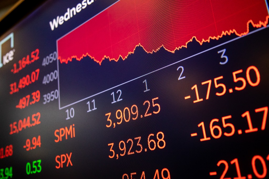 5月18日,在美國紐約證券交易所,電子屏顯示交易信息。紐約股市三大股指18日大幅下跌超3.5%。新華社發(fā)(郭克攝)