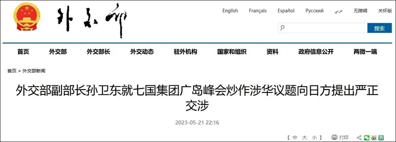 針對日本在G7峰會上操弄涉華議題,中國外交部副部長孫衛(wèi)東21日召見日本駐華大使垂秀夫提出嚴(yán)正交涉。