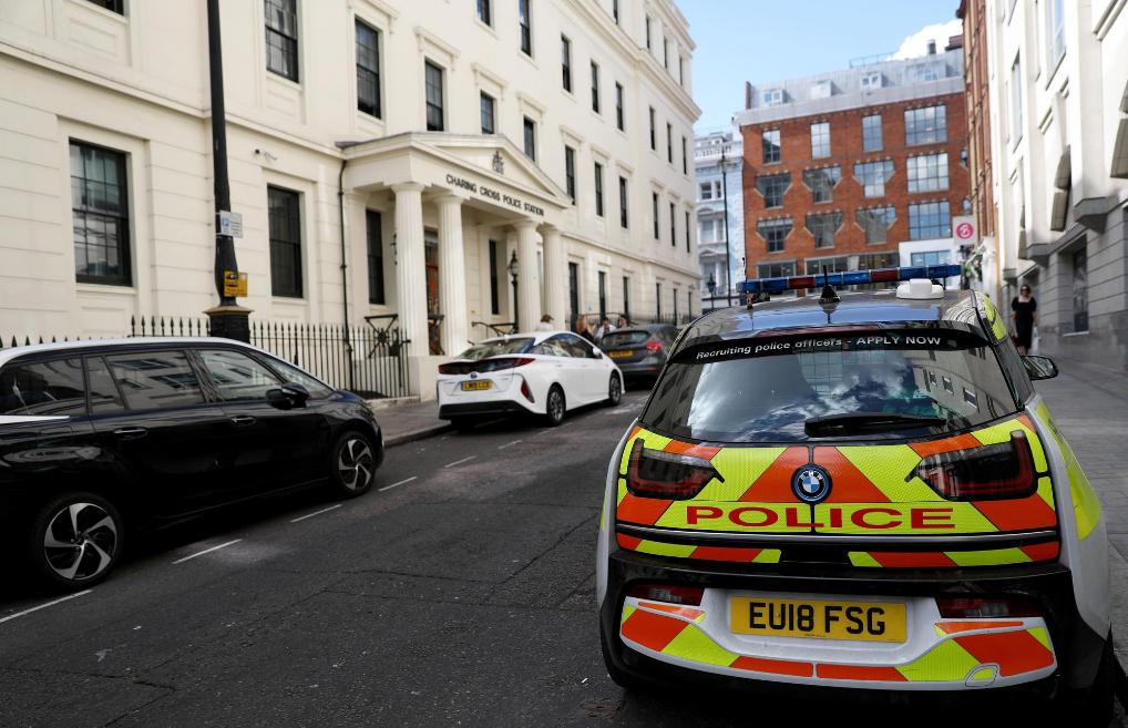 2022年8月8日,在英國(guó)倫敦,一輛警車停在警察局門口。新華社記者李穎攝