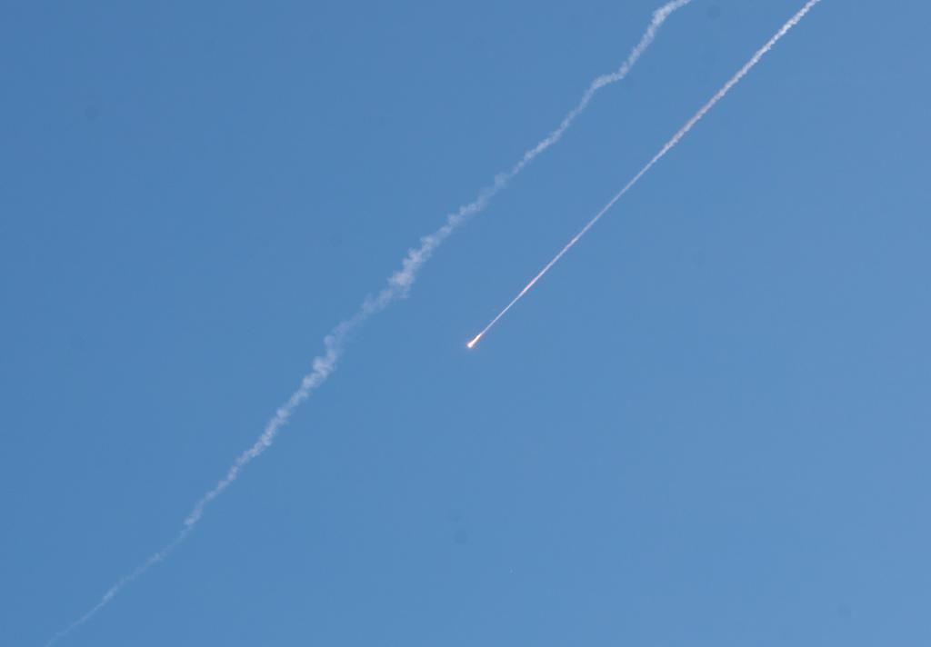6月22日,以色列國防軍說,已探測到伊朗向以色列發(fā)射導(dǎo)彈,目前正在進(jìn)行攔截。圖為在耶路撒冷上空拍攝到的導(dǎo)彈痕跡。新華社記者陳君清攝