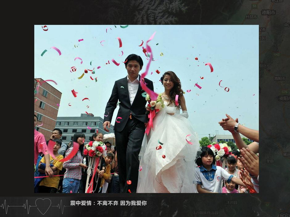 2013年4月21日,盡管余震不斷,雅安市滎經(jīng)縣城一對(duì)新人如期舉行了婚禮,兌現(xiàn)了他們的誓言!4·20”蘆山地震給當(dāng)?shù)鼐用竦纳钤斐珊艽笃茐,在條件簡(jiǎn)陋的臨時(shí)居所里,生活依然在繼續(xù)。新華社記者 楊楹 攝